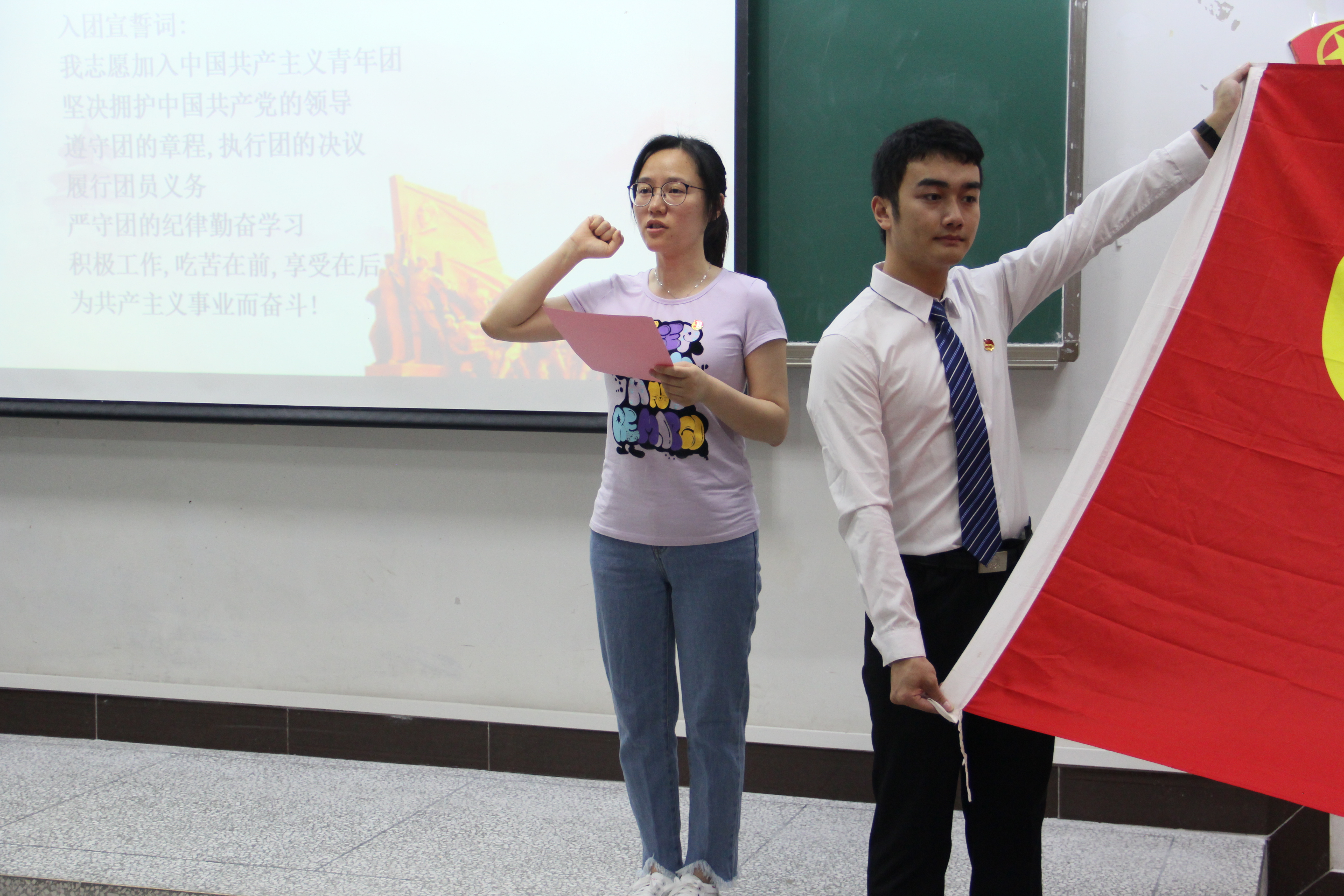 “我们是五月的花海,用青春拥抱时代。我们是初升的太阳,用生命点燃未来”,典礼在嘹亮的团歌声中拉开序幕。首先,杨欢带领全体学员重温入团誓词,从而进一步增强团员意识,促使团员青年按照团章严格要求自己,积极履行团员义务,严守团的纪律,更好地在青年中发挥先锋模范作用。随后,胡文良为开班仪式致辞,他先是向进入本期团校学习的同学表示祝贺,并介绍了关心下一代工作委员会的性质及工作内容,指出老干部、老教师、老教授、老专家、老战士发挥“五老”作用的重要意义。他鼓励大家积极参加“中华魂”征文比赛,最后,向同学们提出了学习要求:一要端正入团、入党动机,树立正确的理想信仰;二要端正学习态度,珍惜难得的学习机会,不仅思想上要积极向共青团靠拢,更要在行动中有所表现;三要以参加团校学习为契机,进一步明确共青团的政治定位和共青团员的政治责任。