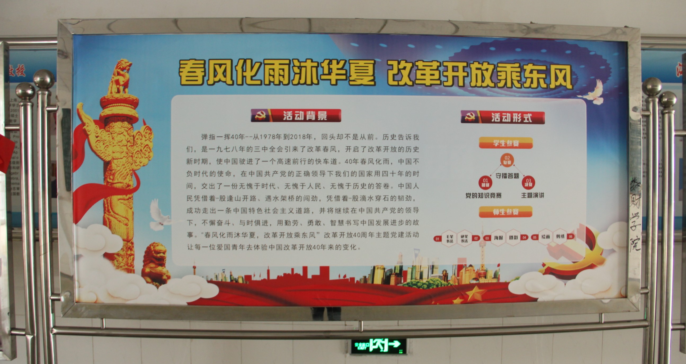 本次对“春风化雨沐华夏 改革开放乘东风”主题党建活动作品的展览,让广大师生在欣赏作品的过程中,与参赛选手一起回顾了中国共产党在这40年间取得的辉煌成就,重温了历史上的重要时刻。同时,也进一步推动了公司党建的发展,坚定了同学们共筑伟大复兴中国梦的信念。