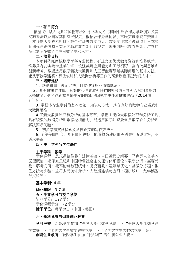 太阳成集团tyc151cc与美国北卡罗来纳大学威尔明顿分校合作举办数学与应用数学专业本科教育项目人才培养方案