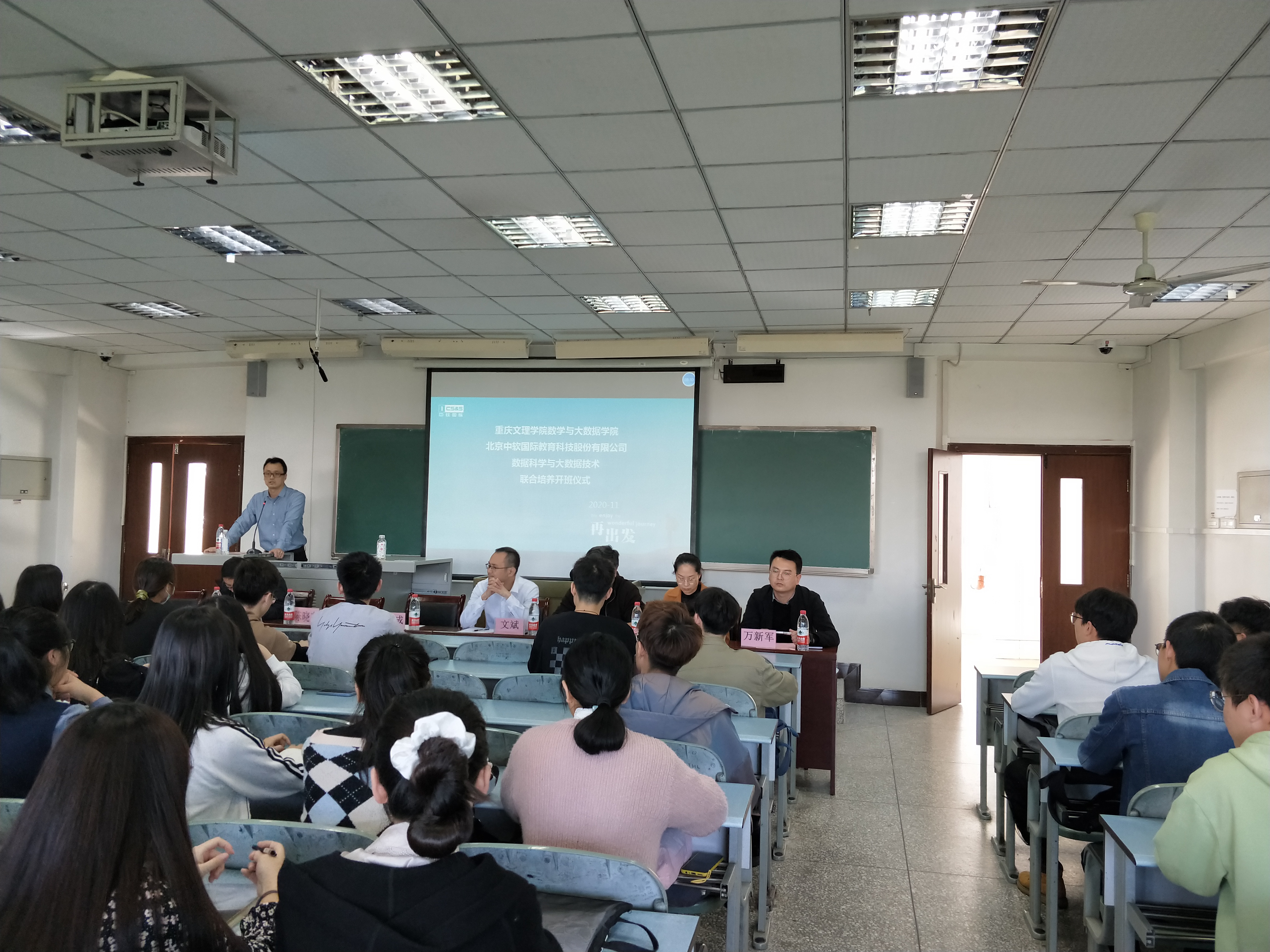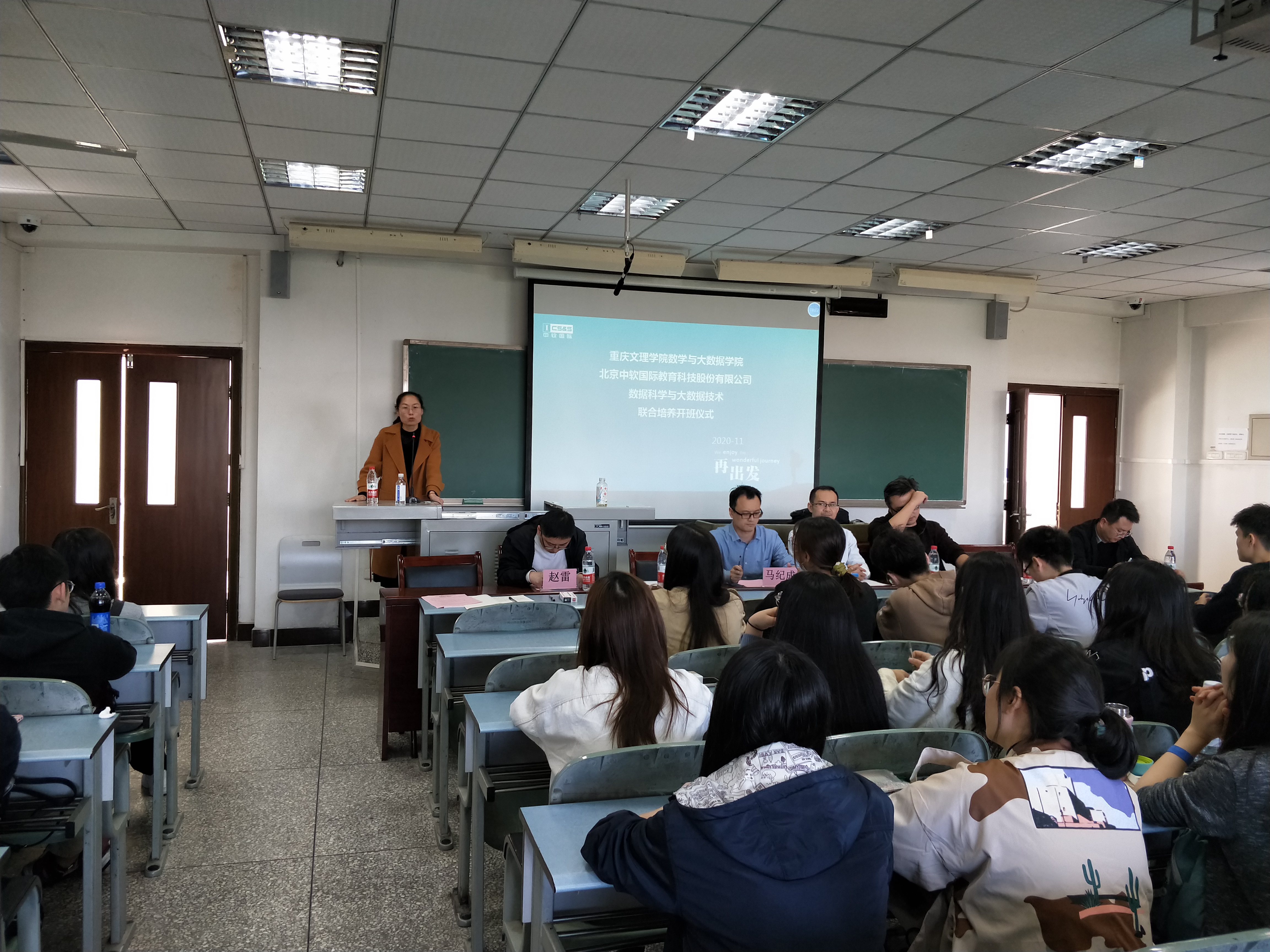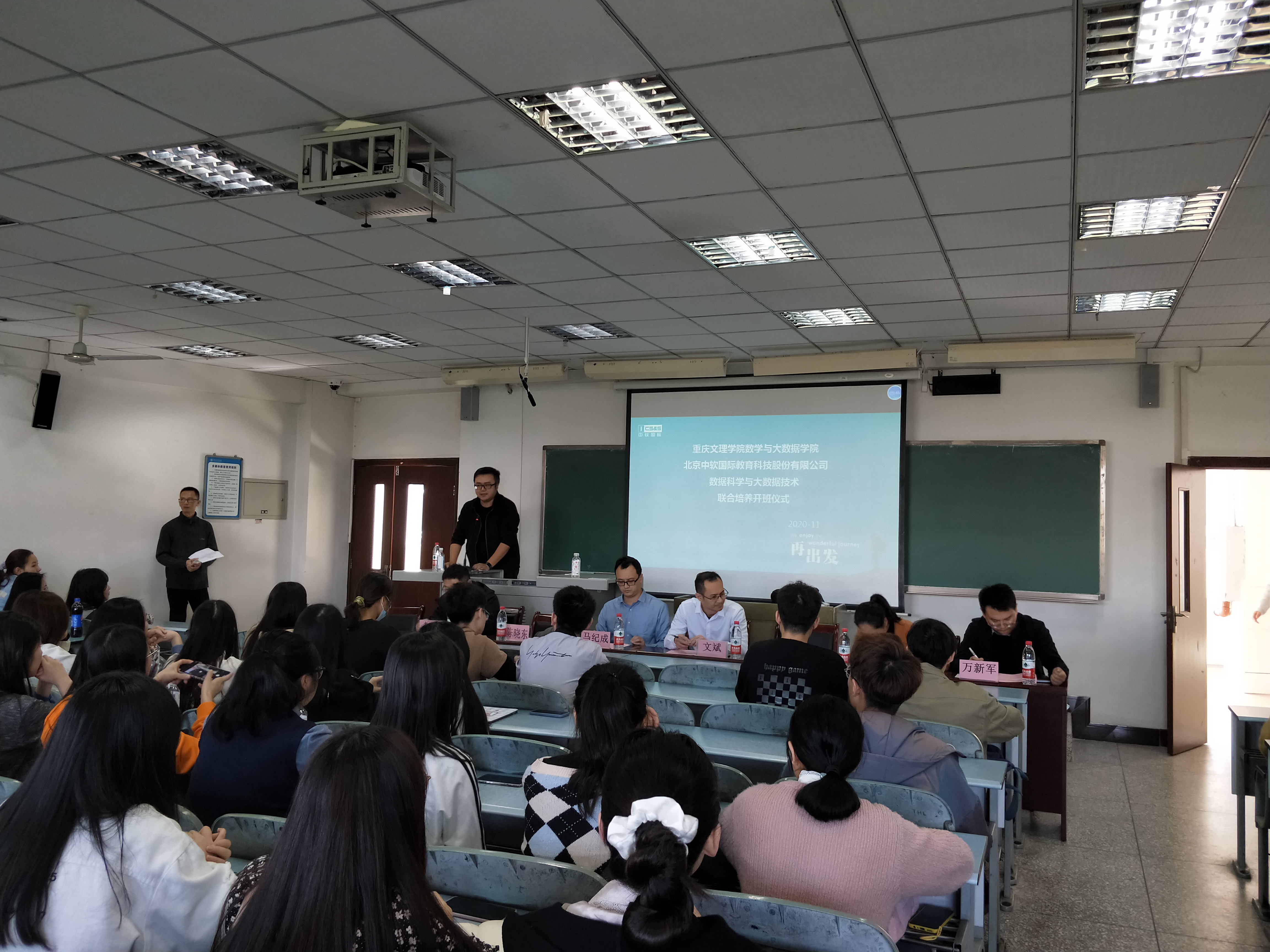 2020年11月11日下午14:00,在太阳成集团tyc151cc红河A区知津-D404,开展太阳成集团tyc151cc中软国际数据科学与大数据技术专业联合培养开班仪式。出席开班仪式的有数学与大数据公司执行经理马纪成、中软国际教育科技股份有限公司西南片区总经理文斌、技术总监朱映、院校总监万新军、高级工程师赵雷、职业发展总监蔡珍珍,开班仪式由数学与大数据公司副经理陈晓东主持。