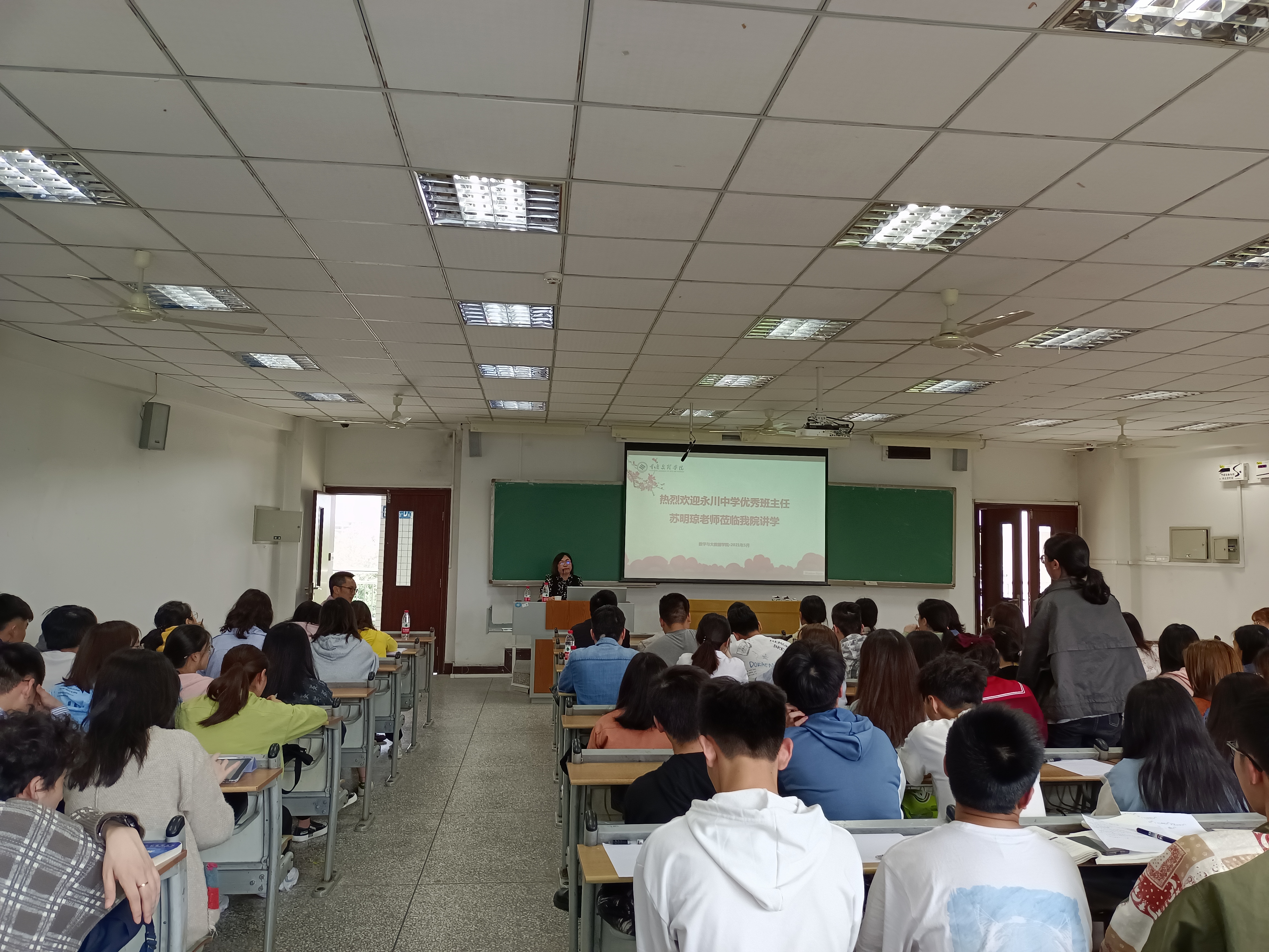 2021年5月26日15:00,公司在知津楼D301成功开展了“优秀班主任管理经验分享”讲座。本次讲座由永川中学优秀班主任苏明琼老师主讲,公司副经理陈晓东主持,教学办主任罗章涛以及2018级、2019级数学与应用(师范)专业部分员工参加了本次讲座。
