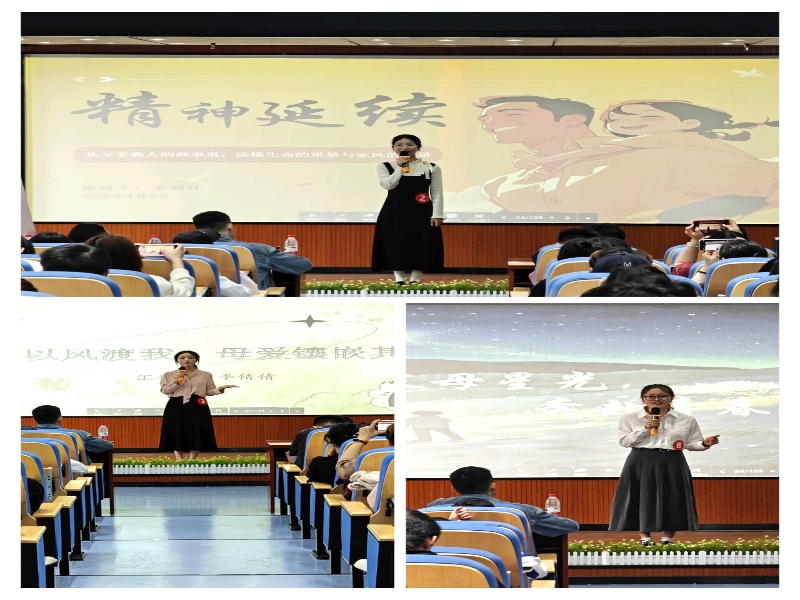 决赛现场,10位选手围绕父母的故事展开深情演讲。沈桂瑶同学在《沉默的土壤中,藏着所有春天的语言》中,以细腻的笔触描绘父亲无言却深沉的爱;宋朝佳同学在《勇为善行家风传》中,讲述父亲见义勇为的事迹,展现平凡中的伟大;李倩倩同学则以《时光以风渡我,母爱镶嵌其中》为题,分享母亲在逆境中守护家庭的温暖故事。选手们或慷慨激昂,或娓娓道来,真挚的情感感染了在场每一位观众。